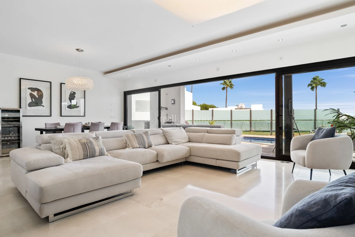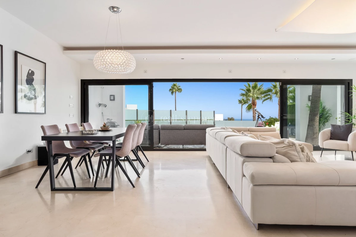 The interior comes fully furnished, showcasing a sleek, fully fitted kitchen, a bright dining room, and an inviting living area. Floor-to-ceiling glass doors flood the home with natural light while framing panoramic vistas of the sea, mountains, golf course, and surrounding greenery. Enjoy unobstructed views stretching across the coastline, a spectacular setting for entertaining or sunset cocktails.