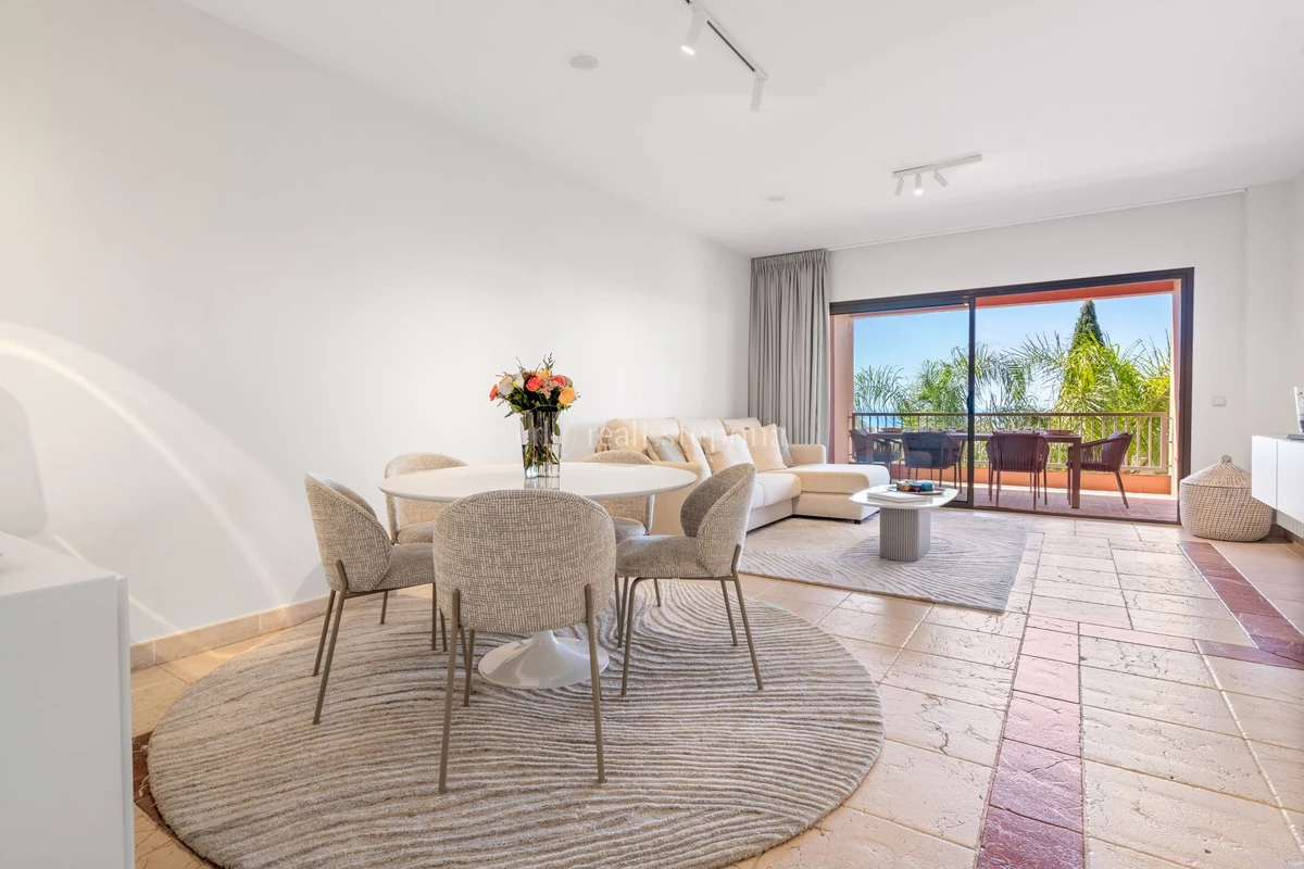 This elegant two-bedroom, two-bathroom apartment offers a bright and spacious layout designed to maximise comfort and natural light. The stylish living and dining area opens directly onto a generous terrace, where stunning panoramic views of the Mediterranean Sea and the lush Los Flamingos golf course create the perfect setting for relaxing or entertaining.