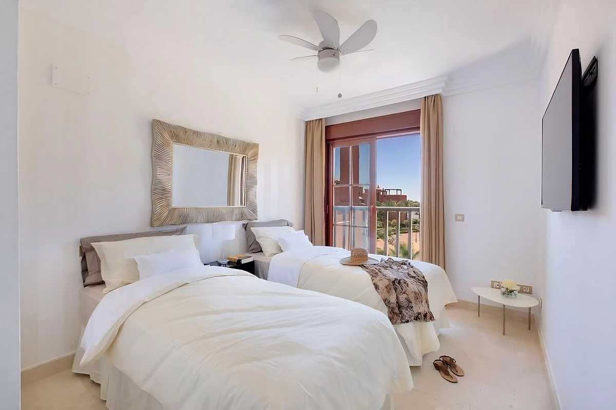 The master bedroom comes with an en-suite bathroom and direct access to the terrace. Two additional bedrooms share a modern bathroom. The property is equipped with air conditioning (hot and cold), marble flooring, fitted wardrobes, and high-end finishes throughout.