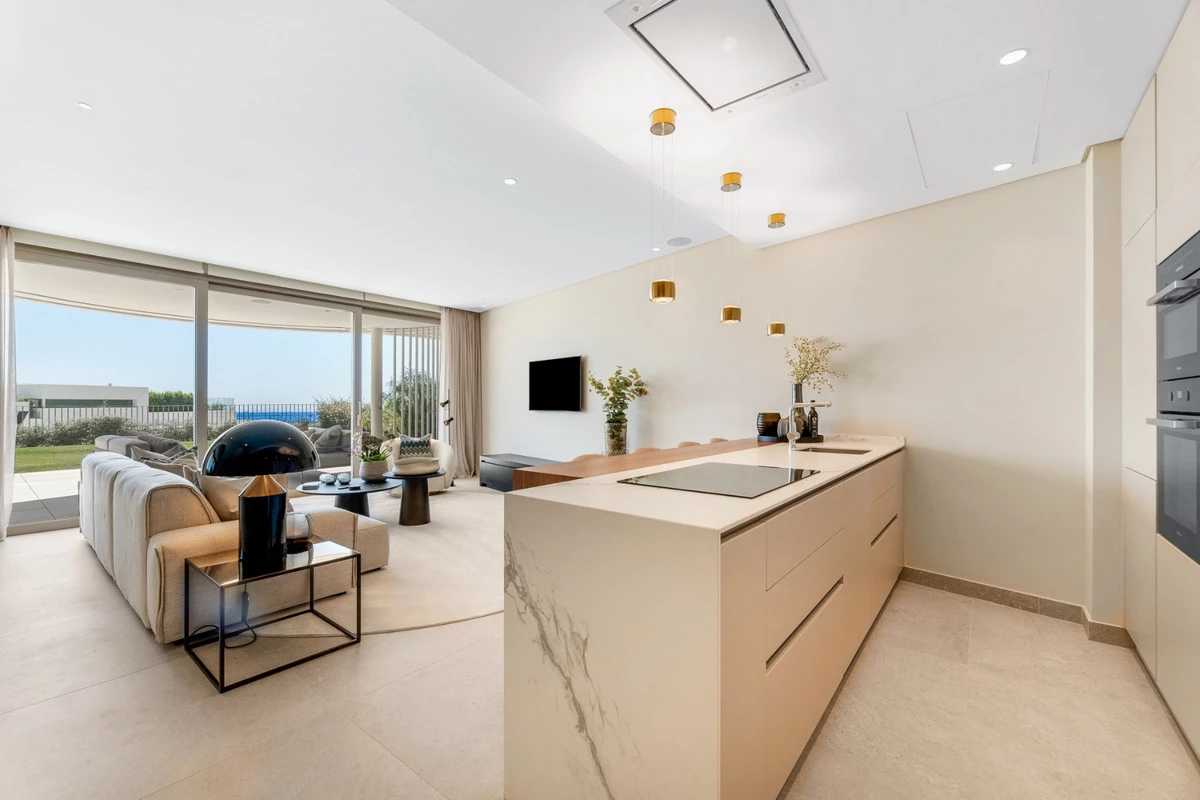 The apartment itself exudes refined elegance, featuring spacious interiors and an open-plan living and dining area with floor-to-ceiling windows that fill the space with natural light. Sliding glass doors connect seamlessly to expansive terraces and a private 126 m² garden — the perfect setting to enjoy panoramic sea views and spectacular Mediterranean sunsets. The contemporary kitchen is equipped with high-end appliances, while the two en-suite bedrooms offer comfort and privacy. A guest toilet adds further convenience. The property also includes two private parking spaces with pre-installation for electric vehicle charging and a storage room.
