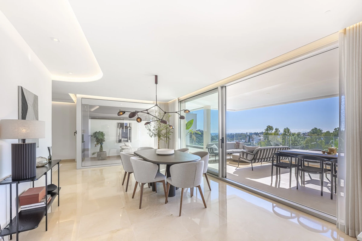 Located in the exclusive gated community of Botanic in La Reserva del Alcuzcuz, this exceptional duplex penthouse offers one of the most captivating viewpoints. From its elevated position, 180º panoramic views unfold across the green valley, the Mediterranean Sea, and, on clear days, the distant outline of Morocco. Surrounded by nature yet just a short drive from the beaches of Marbella and Estepona, Puerto Banús, and the charming restaurants of Benahavís Pueblo, the location beautifully balances tranquillity and accessibility.