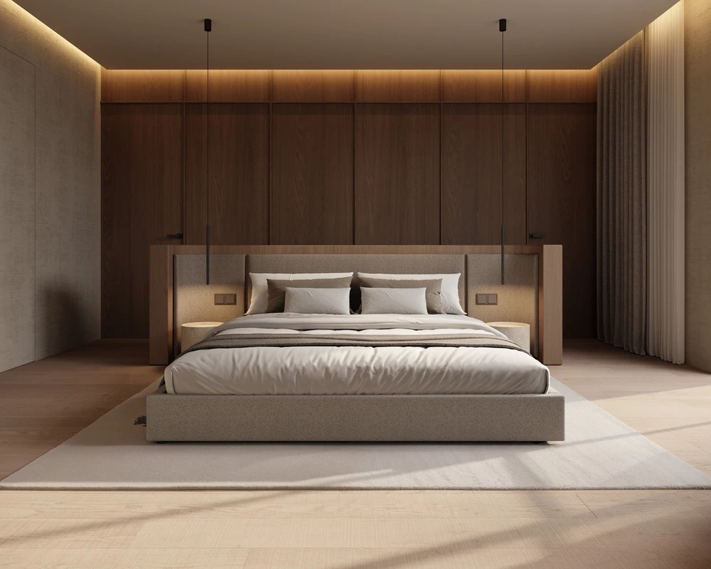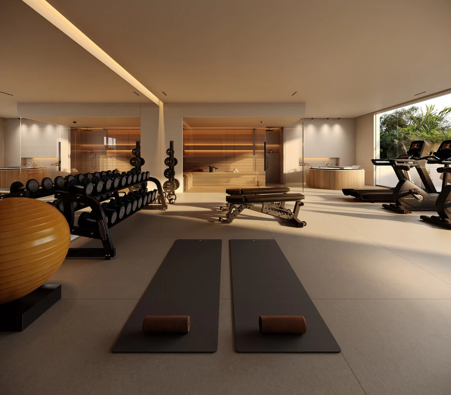Descending from this access level brings us to the upper floor, which includes the vertical communication core, a distributor, a guest toilet, a technical room, an electrical room, and a gym with sauna that opens onto a pergola-shaded terrace, creating a private wellness area with ample natural light and comfort.