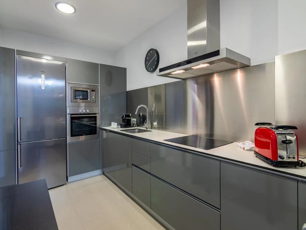 A modern, fully equipped kitchen and a separate laundry room provide optimal functionality. Additional highlights include air conditioning (hot/cold), marble floors, two underground parking spaces, and a storage room.
